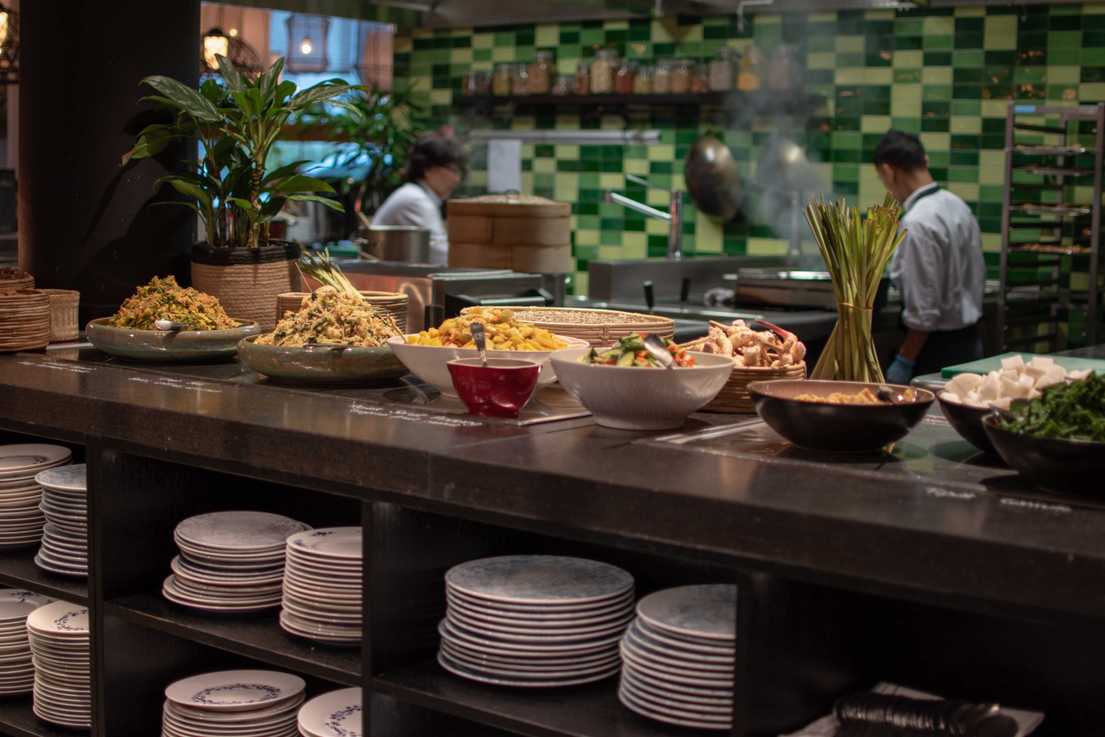 Wanneer je genoeg voorgerechten hebt gegeten, kun je doorgaan met het hoofdgerecht. De hoofdgerechten zijn een mix van made to order en het buffet. Aan het buffet kon je een stuk krijgen van het speenvarken of gestoomde zeebaars. We kregen verder van alles op de kaart een kleine portie op tafel. Dat betekende: kipsaté, in bananenblad gestoomde champignons, beef rendang, pulled chicken, gefrituurde aubergine, curry tahu, nasi koenig, gebakken rijst en noodles. Een hele tafel vol dus! Goed om te weten is dat de brunch hier begint om 12.30. Wat mij betreft een goed idee, want het is wellicht wat heftig op een geheel lege maag. Maar, het is super smakelijk! Lekker pittig waar nodig, veel gebruik van kruiden en de herinneringen aan Bali komen meteen terug. De smaken zijn precies zoals ik het me herinner.