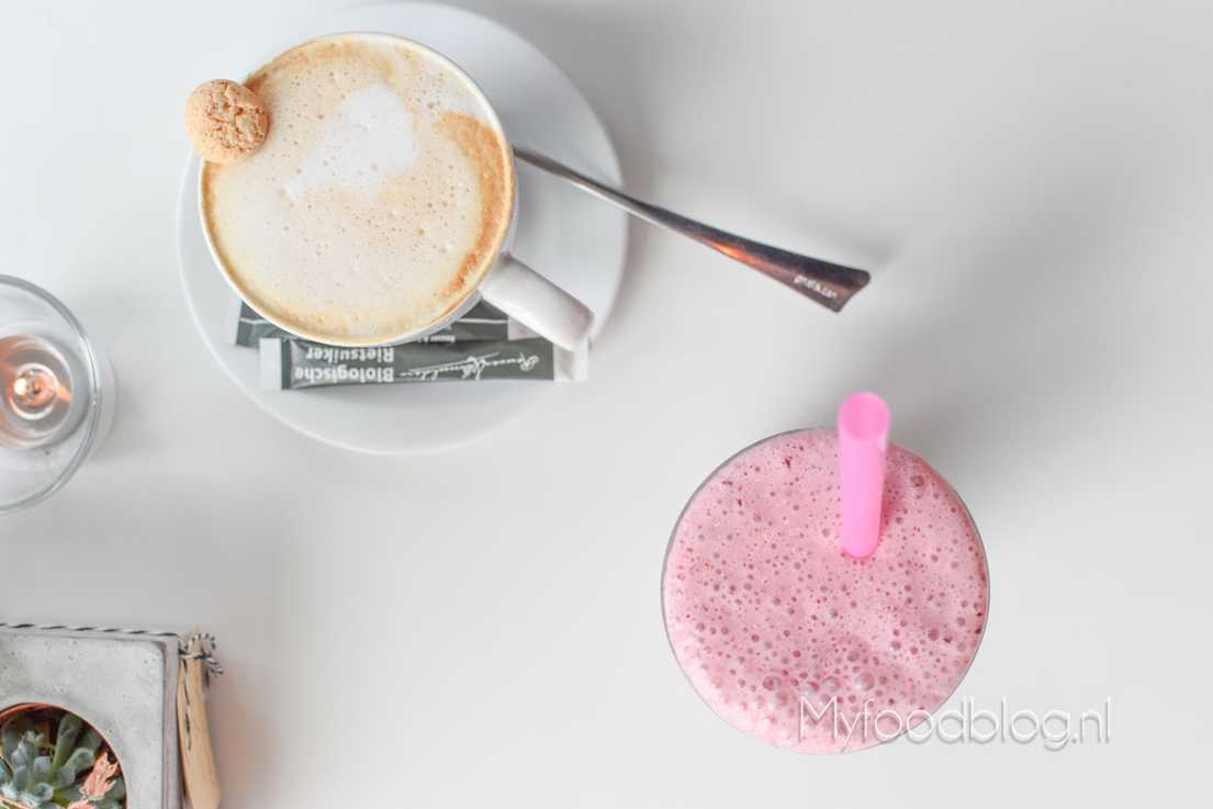 Ik stond op het punt om ze te bellen, maar broertje wilde het perse zelf vinden en het bleek om de hoek te zijn, aan de kant van de Schiekade. Naast de Schiecentrale waar o.a. ‘Rayman is laat’ wordt opgenomen. Veel van de klanten zijn dan ook mensen die in één van de omliggende gebouwen werken, TV Rijnmond bijvoorbeeld, de Schiecentrale of een van de vele kleine webbureaus. Ook is er in de buurt veel in aanbouw, dus ook buurtbewoners komen er graag. Wij strijken neer en beginnen met een frambozen fruitshake en een grote cappu. Mijn frambozen fruitshake is gemaakt met yoghurt en melk en is lekker verfrissend.