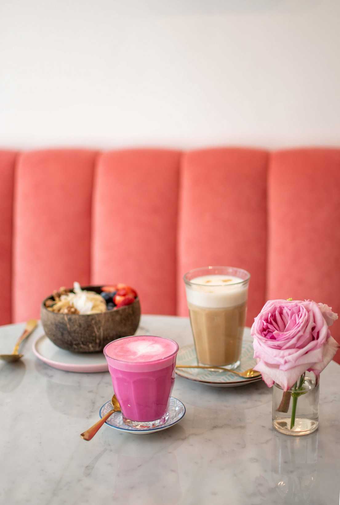 Als je hier binnenkomt, wil je meten foto’s maken. Sterker nog, je ziet ook veel mensen foto’s maken. Het is echter niet alleen maar ‘a pretty face’, want naast de roze fluwelen bank, het vele marmer en wit, kun je hier ook lekker eten! Het menu focust zich met name op ontbijt, brunch, lunch en tussendoortjes. Zo kun je er kiezen uit diverse smoothiebowls. Ik ging voor de açai-bowl met een basis van açai-banaan, rijkelijk getopt met huisgemaakte granola en seizoensfruit. Verder is er onder meer een matcha bowl en een mango bowl die erg goed schijnen te zijn. Liever wat anders? Een van hun andere signature dishes zijn de ‘red velvet pancakes’, rode pannekoeken met een frosting erbij. Die zijn erg machtig, maar wel lekker! Andere pancakes zijn er ook. Of ga je liever voor een gepocheerd eitje en brioche brood?