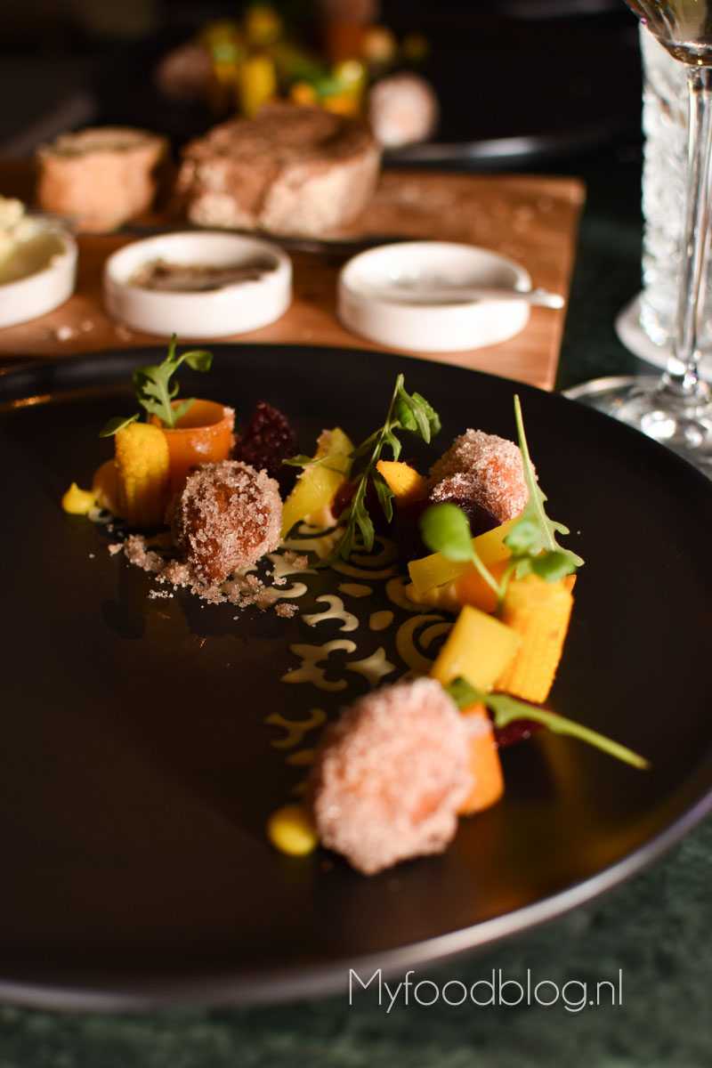 We werden in Grand Hotel De Draak meteen super gastvrij ontvangen. Na wat tips over de binnenstad van Bergen op Zoom te hebben gekregen, gaan we eventjes de stad in. Door de frisse lucht is meteen onze eetlust opgewekt en dat komt goed uit. Op ons wacht namelijk een 8-gangen diner inclusief wijnarrangement. We beginnen met een champagne als aperitiefje, samen met een hartige madeleine. Dit is overigens nog niet de eerste gang, maar ‘slechts’ een opwarmertje. Wat daarna volgt zijn bijzondere gerechten die heerlijk in balans zijn. De klassieke Franse keuken, maar dan niet zo klassiek. Dat er invloeden zijn van over de hele wereld is meteen duidelijk: Japanse yuzu, Spaanse churros, Chinese 5 spices, maar ook de Hollandse oliebol. Het voorgerecht met churros is een mooi voorbeeld van de stijl van chef-kok Sander Doggen: zoet, zout, zuur en bitter zijn prettig in balans. Wat de gastheer vertelt over het gerecht maakt het helemaal leuk: de chef is in Spanje verschillende churros kraampjes langsgegaan om het beste recept te vinden. Het eten is van ongekend hoog niveau en het is te zien dat de chef bij diverse sterrenrestaurants heeft gewerkt.