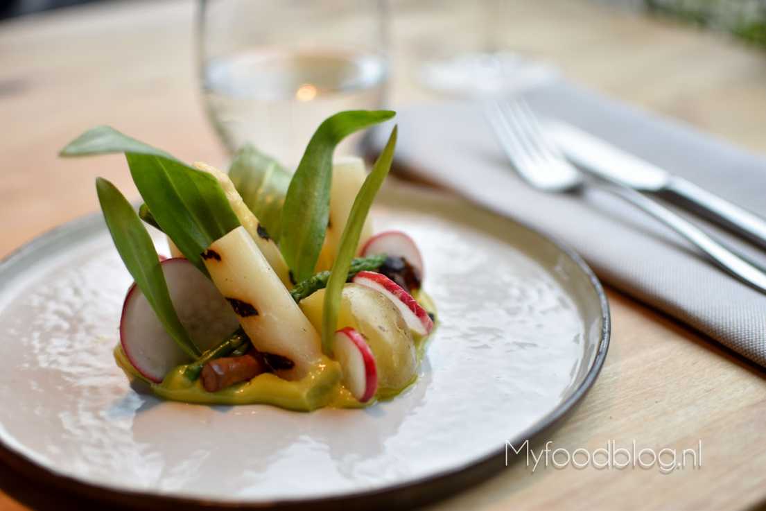 Na de charcuterie volgt een bieten gazpacho. Het had al snel té fris kunnen worden, maar de geiten yoghurt zorgt voor een goede balans. De kleuren zijn natuurlijk schitterend en dat de gazpacho aan tafel op je bord wordt geschonken draagt daar enkel aan bij. Overigens hebben we ook een wijnarrangement dus bij elke gang krijgen we een nieuwe wijn waar ook uitgebreid over wordt verteld. Zo is er de Grüner Veltliner die voor zijn soort wat fruitiger is. Dit gaat perfect samen met ons voorgerecht van witte en groene asperges met lamsoor en Utrechtse Sint-Jansui en cantharellen.