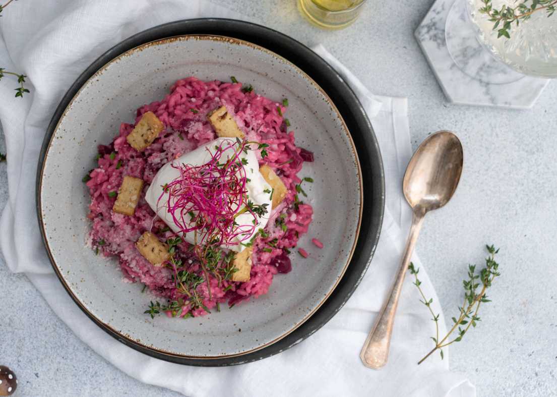 Rode bietenrisotto met mozzarella en gerookte tofu