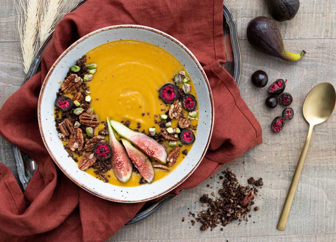 Het leuke van een smoothiebowl vind ik altijd het toppen. Je kunt het zo gek maken als je zelf wil. Dit keer ging ik voor zelfgemaakte granola, geroosterde pecannoten, pistachenoten, verse vijgen en chocolade frambozen. Nog meer smoothiebowls maken? Hier vind je 10 heerlijke smoothiebowls. Tip: pompoenpuree kun je zelf maken door geschilde pompoen in blokjes te stomen of koken en te pureren. Je kunt het ook kant-en-klaar kopen. (Gebruik de code JUDITH voor korting bij het afrekenen).