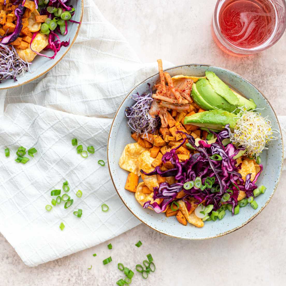 Een buddha bowl is een kom vol lekkers (vaak veganistisch), met in ieder geval zoete aardappel. In deze kleurrijke variant vind je ook ingelegde rode kool, kiemgroenten, avocado's, bosui. En misschien wel het meest verrassend: chips. Ja echt! Ik gebruikte linzenchips uit de oven. Deze zijn gezonder en super lekker en knapperig. Een lekkere knapperige touch aan je kommetje!