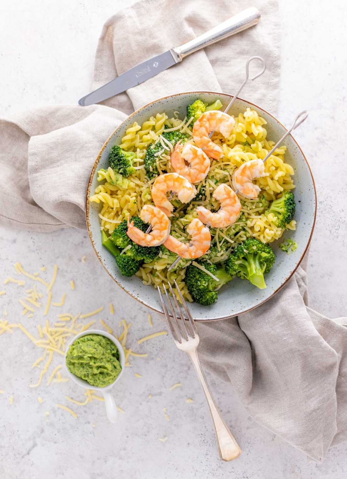 Voor wat extra bite, doe je de helft van de gekookte broccoli in zijn geheel door de pasta. Afgemaakt met de heerlijke garnalenspiesjes is het echt een feestje om deze pasta te eten. Bovendien is 'ie ook nog eens snel klaar dus een prima doordeweekse maaltijd.