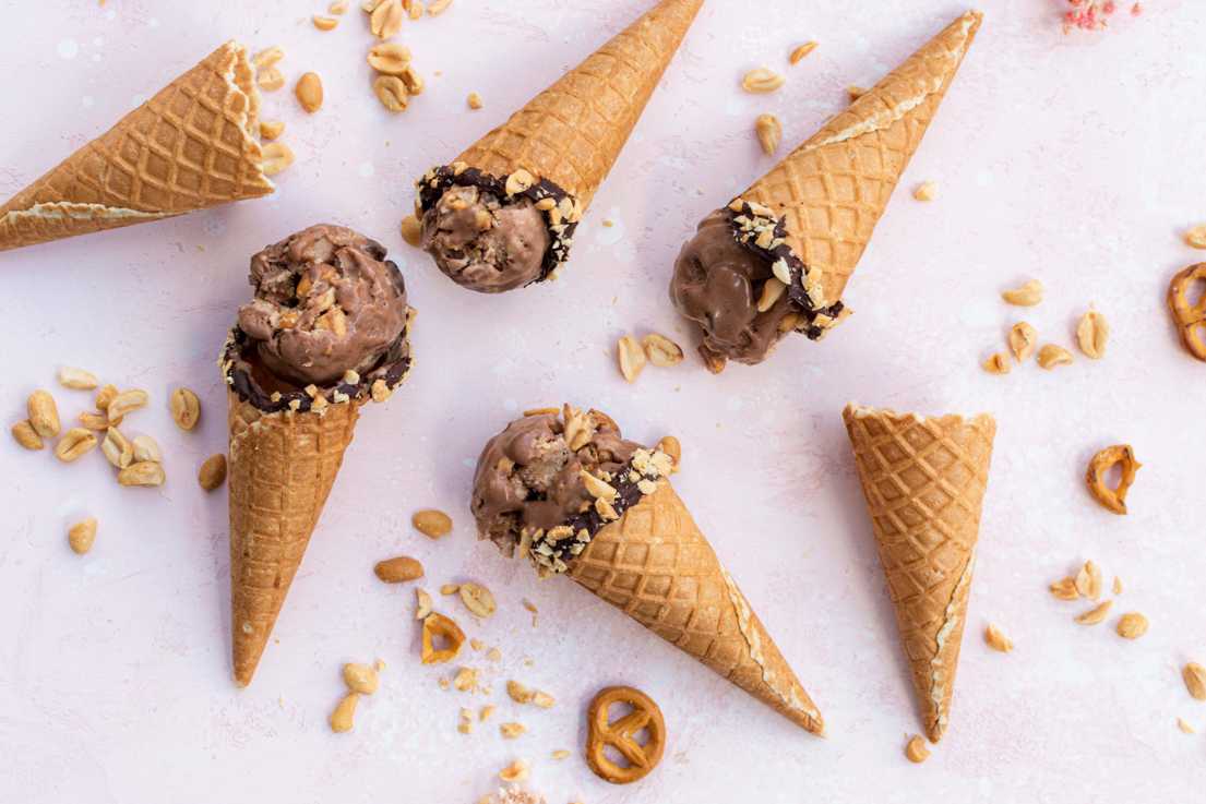 De toppings aan het einde, de chocolate chips, pinda's en mini pretzels maken het helemaal af! Het gevoel van een heerlijk luxe ijsje, maar dan net even wat gezonder. En trouwens, hoe leuk is het om te kunnen zeggen dat je zelf je eigen ijs hebt gemaakt? Je kunt het ijs serveren in een bakje of in een hoorntje. Als je een oubliehoorn kiest, let dan even op als je glutenvrij of vegan eet. Maar eerlijk, in een bakje is ook heel erg lekker ;-). Het allerlekkerste is het ijs als je het 10- 15 minuten van tevoren uit de vriezer haalt. Dan wordt het net even wat zachter en kun je makkelijker bolletjes scheppen. Meer ijs maken zonder ijsmachine?
