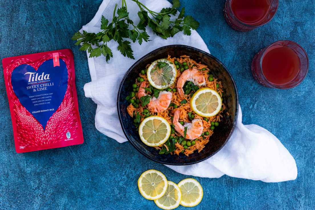 Ik gebruikte Tilda Basmati rijst sweet chilli & lime. Een premium Basmati rijst die al heerlijk op smaak is gebracht en gegaard is. Het enige wat je hoeft te doen, is de rijst 2 minuten in de magnetron op te warmen. Deze smakelijke rijst vormt de perfecte basis voor onze snelle paella. Intussen blancheren we de erwten en grillen we de garnalen. De Tilda gestoomde rijst is er in allerlei lekkere smaken. Wat dacht je van jasmijn, kokos of tomaat-basilicum? Daarnaast kun je ook gaan voor de niet voorgestoomde Basmati rijst. Je koopt deze 'champagne onder de rijstsoorten' bij Albert Heijn. Neem dus de volgende keer dat je boodschappen doet, deze rijst mee als basis voor je lekkerste rijstgerechten om bijvoorbeeld dus deze snelle paella te maken!