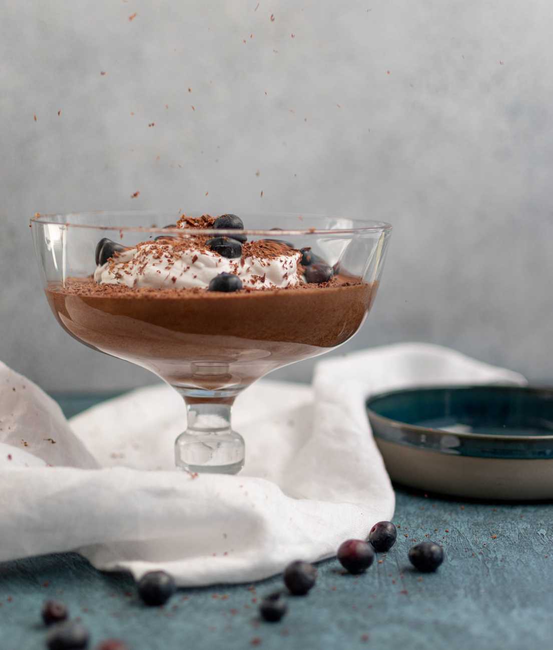 Twijfel je? Klop dan nog even door. Waar eiwitten kunnen inzakken als je ze te lang mixt, zal dat bij aquafaba niet zo snel gebeuren. Nadat je het kikkererwtenvocht hebt stijf geklopt, vouw je voorzichtig het chocolademengsel er doorheen. Ik vond dat zelf het makkelijkste gaan door eerst een klein beetje van de opgeklopt aquafaba door de chocolade heen te vouwen om vervolgens dat door het restant aquafaba te vouwen. Het zal iets inzakken tijdens het vouwen, maar dat is niet erg, je zult alsnog een heerlijk luchtige vegan chocolade mousse krijgen!