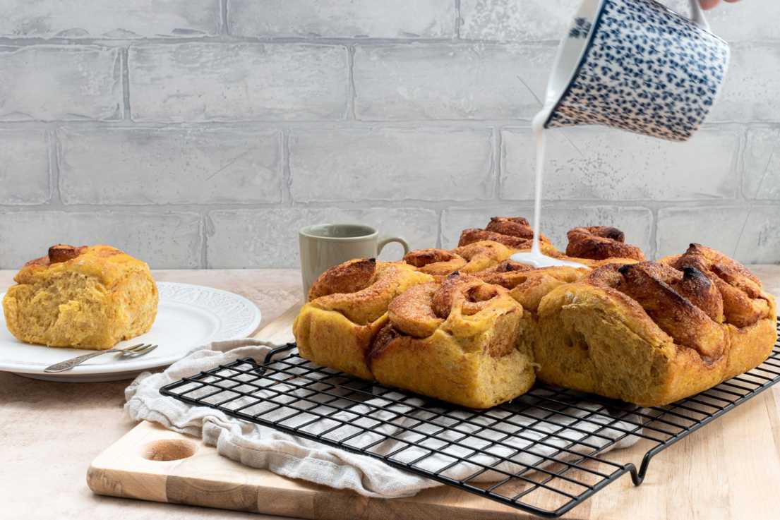 Je proeft de pompoen niet, maar je krijgt een licht oranje gloed in je broodjes. Bovendien heb je zo ook weer eens wat groente in je brood ;-). Door de mix van volkoren meel en tarwebloem is het ook net weer wat gezonder. Bovendien combineert het volkoren meel heel goed met de pompoen.Cinnamon buns voor ontbijt of tussendoor