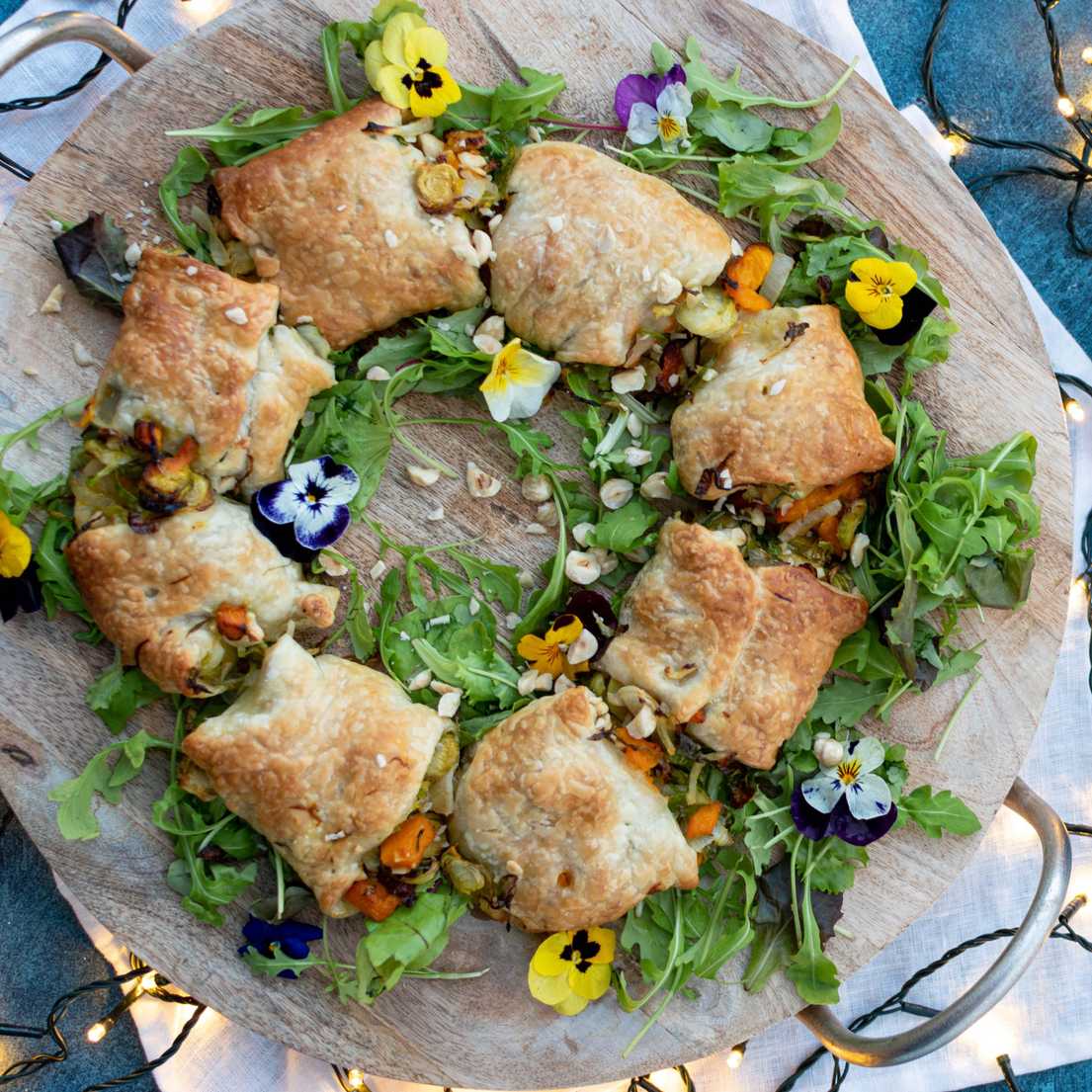 In deze vegetarische kerstkrans vind je pompoen, spruitjes, hazelnoten, zongedroogde tomaten en meer. Op eenvoudige wijze kun je het recept aanpassen. Wil je het recept helemaal plantaardig maken? Dan wissel je het bladerdeeg in voor een vegan bladerdeeg (zonder roomboter dus). Wij deden er geitenkaas bolletjes op, maar deze kun je ook prima achterwege laten. Sterker nog, in het originele recept van PLUS wordt geen geitenkaas gebruikt. Wil je het recept glutenvrij maken? Dan gebruik je glutenvrij bladerdeeg.Feestelijk