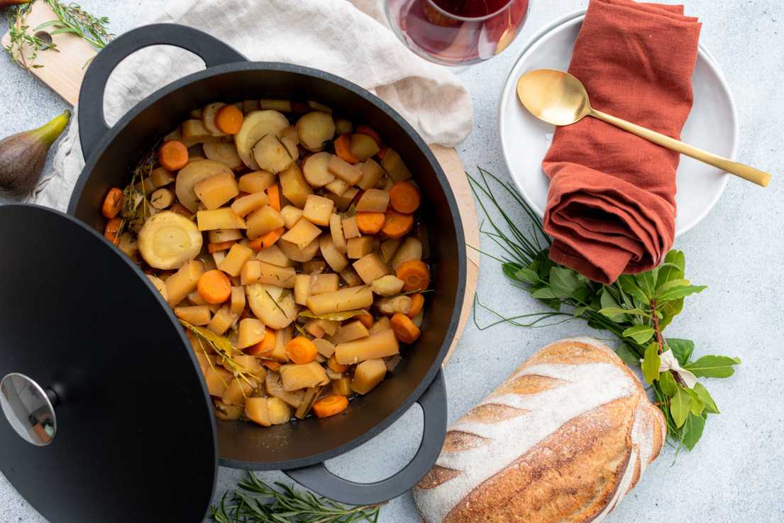 Vegetarische herfst stoofpot met pastinaak en meiraap