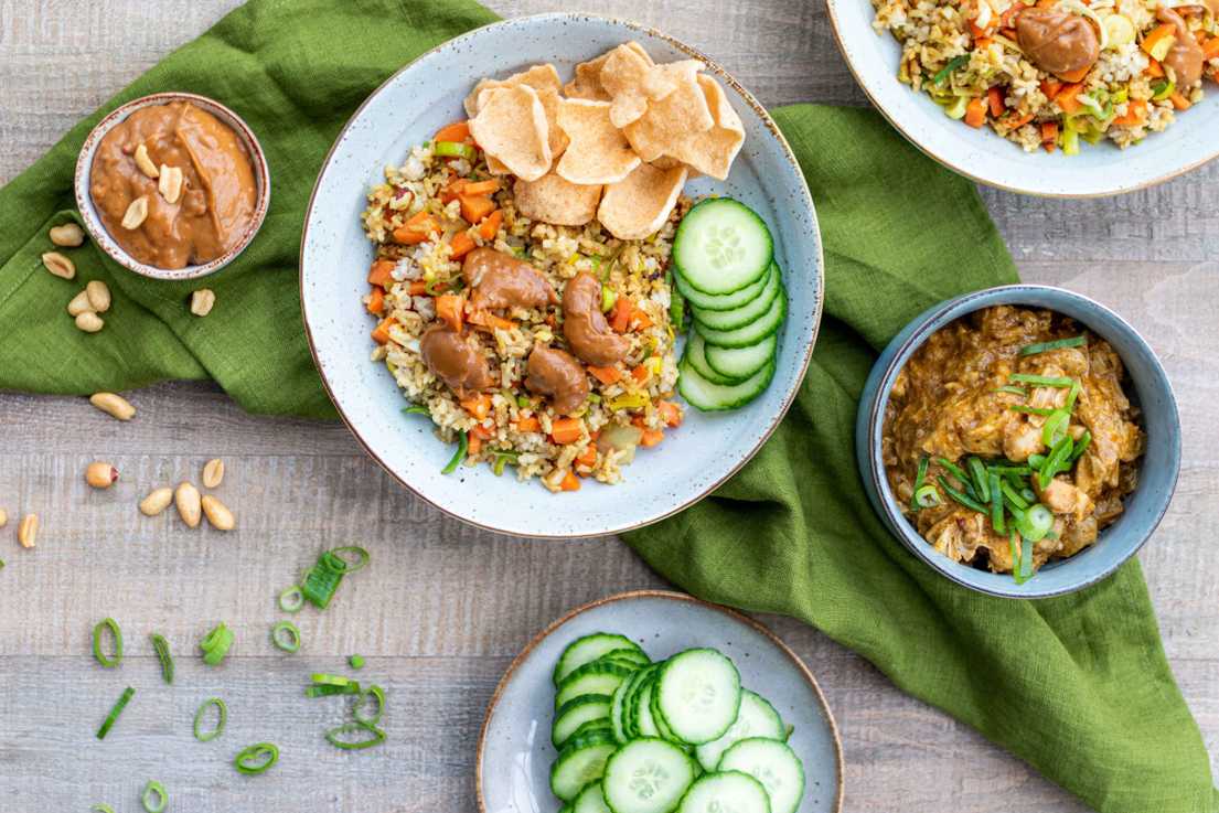 Nasi goreng met satesaus, komkommer en vegetarische rendang