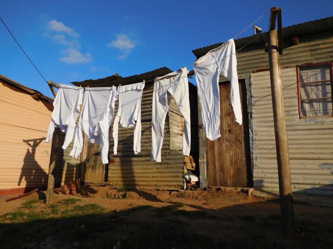 Voordat we echt de Township in gingen, was het tijd voor een lunch bij Junior zijn zus en nichtje thuis. Ze wonen samen met hun kinderen in het huis van hun overleden oma. Het is een klein huisje gemaakt van stenen, dus toch een soort luxe huis voor Afrikaanse begrippen. We kregen brood, spinazie, zoete aardappel, een ander soort aardappel en kippenpootjes. Nu eet ik thuis ook wel eens kippenpootjes, althans… ik noem het altijd kippenpootjes. Officieel heten het drumsticks of kippenvleugeltjes. Hier, aan de rand van de grootste sloppenwijk van Durban, thuis bij de nicht en zus van onze lokale begeleider Junior, kreeg ik échte kippenpootjes.
