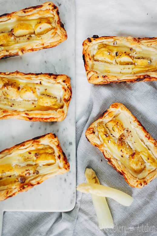 - Zoete bladerdeegtaartjes met asperges en perzik (foto hierboven)