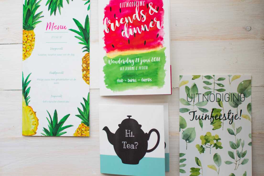 Trouwuitnodigingen, maar ook andere uitnodigingen. Een uitnodiging voor een high tea, tuinfeest of barbecue bijvoorbeeld. Het leek mij superleuk om uitnodigingen te maken voor het etentje. Er was ruime keuze, dus dat was nog lastig kiezen. Ik besloot echter dat het zo leuk was, dat ik er ook wel bijpassende menukaarten bij wilde. Het thema van de kaarten werd een lekker tropisch thema met ananassen en watermeloenen.