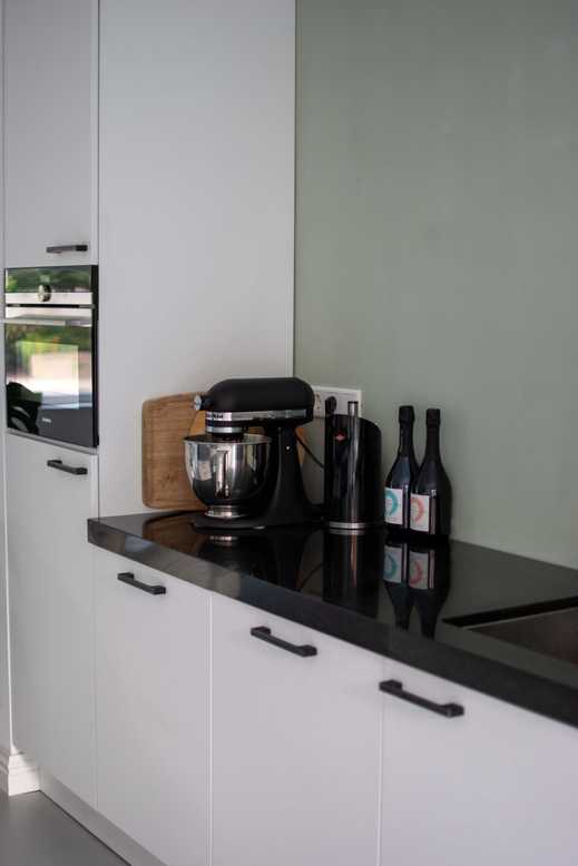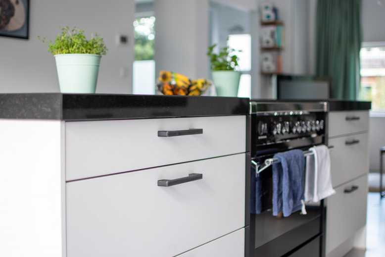 Op het eiland is superveel plek om te werken. We hebben zogenaamde twist stopcontacten, die verzonken zijn in het blad en dus ook niet in de weg zitten. Als blad kozen we voor graniet. Beton vonden we ook erg mooi, maar we kregen een aantal keer het advies dat niet te doen, omdat het ontzettend poreus is. Natuurlijke materialen, daar houden we van, dus uiteindelijk kwamen we uit op een donker granieten blad. In combinatie met de matte witte kastjes top! Als je natuurlijke materialen ook overweegt, kun je dus kiezen voor beton (maar wees gewaarschuwd ;-)), granieten blad, een houten blad of mooie houten keukens.
